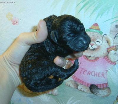 Sotva třítýdenní Báru, pojmenovanou po její babičce, jsem si kradla do postele a zírala na ní jako na největší poklad světa, kterým pro mě i skutečně byla. Byla nejmenším ze štěňátek , přesto když jí bylo jen něco přes měsíc hravě přelezla štěněcí ohrádku, takže jsem si specielně pro ní brala na břicho batůžek a nosila jí jako klokana po bytě, aby nevyváděla.